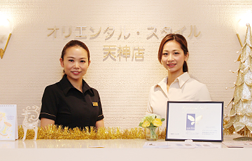天神店は2012年にオープンしたオリエンタル・スタイルで一番新しいサロンです。九州・福岡の中心地である天神に位置しており、アットホームで通いやすいサロンには20代~70代のお客様まで幅広く通って頂いております。お客様一人一人のご要望・目的にあった施術を行っております。エステの施術はもちろん、ホームケアの方法やダイエットレシピのご紹介なども行っております。また、マイクロフレグランスを導入している天神店のサロン内にはリラックスできる香りが漂っており、白と茶を基調としたラグジュアリーな空間はそこにいるだけで気分が上がります。(天神店の香りのこだわりは新聞でもご紹介されました!)清潔感溢れる天神店で身も心もキレイな女性を目指しましょう♪